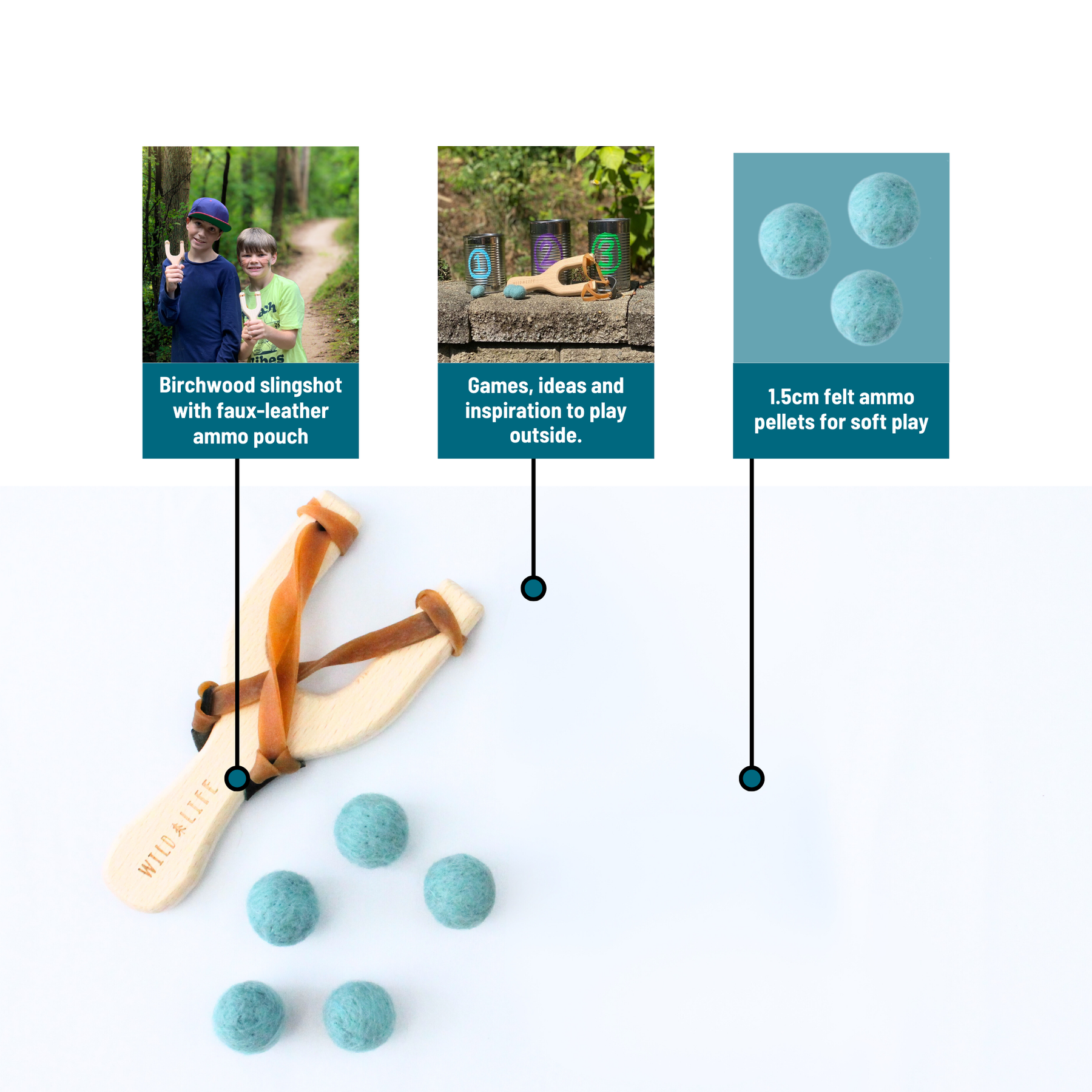 • 5× Soft Felt Pellets: 2.5 cm diameter felt pellets provide perfectly safe slingshot ammo for backyard target games.
